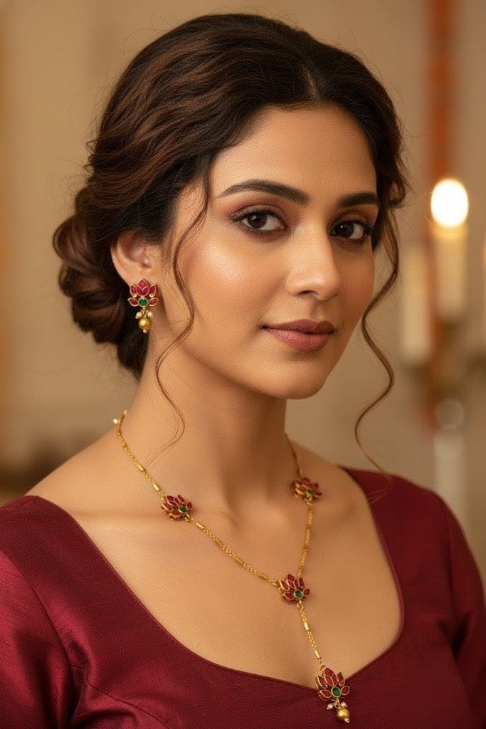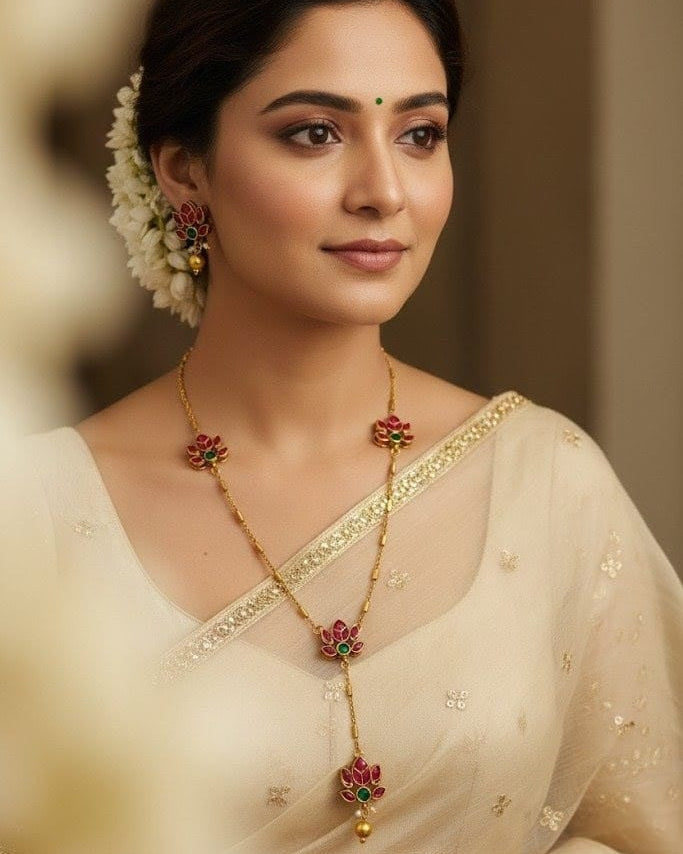 Gold-Plated Lotus Flower Y-Necklace with Pink and Green Stones Traditional Jewelry Set LTN002