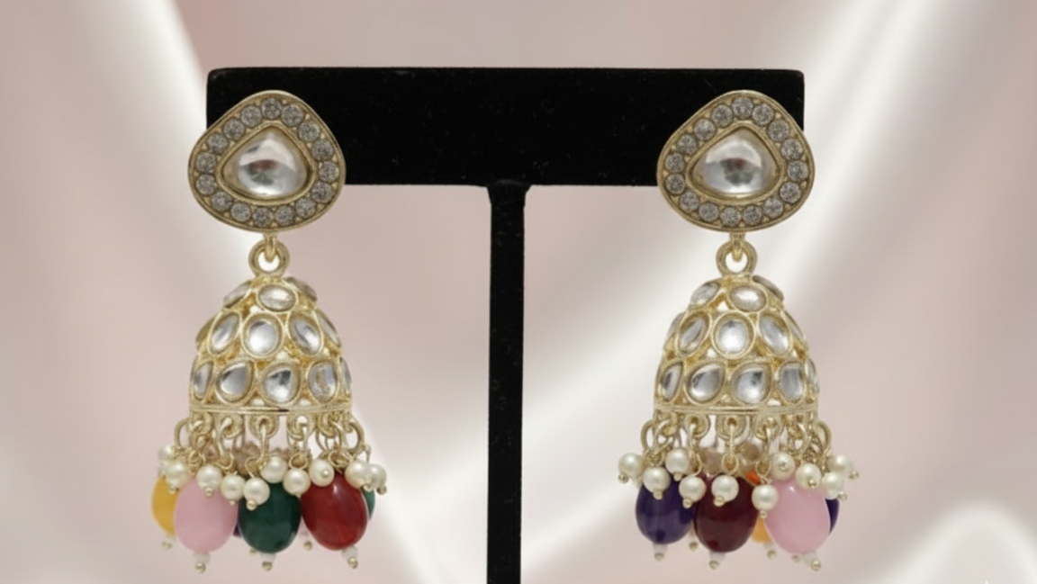 Elegant Gold-Tone Kundan Jhumki with Colorful Beads CHB001
