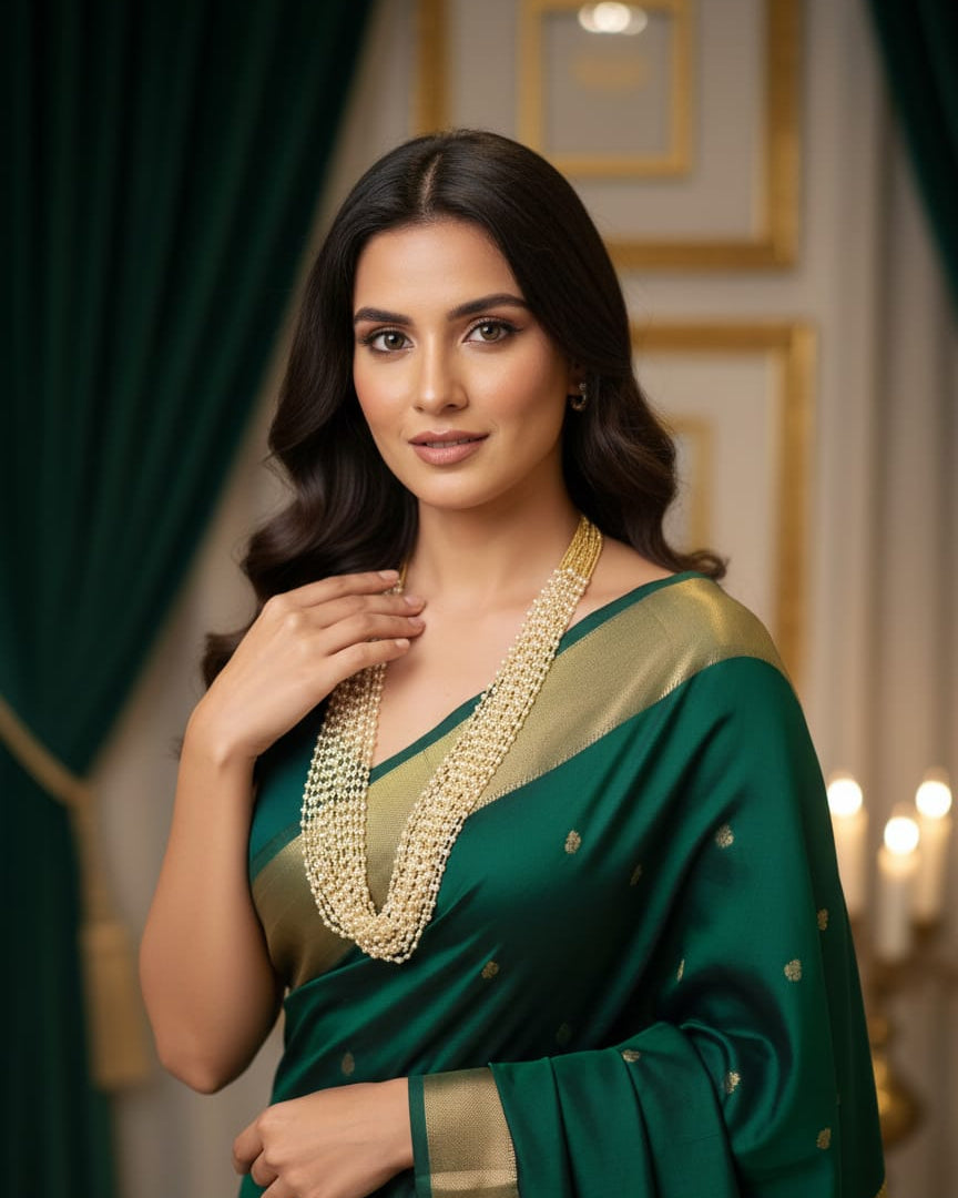 The Multi Layered Pearl Mala is a sophisticated necklace that showcases the timeless elegance of cultured pearls arranged in multiple graceful tiers. Suspended from a refined golden string, this piece demonstrates exceptional attention to detail and quality construction. The layered design creates visual interest and dimension, allowing light to play across each pearl's lustrous surface. The compact proportions ensure comfortable wear without compromising on presence. An investment in enduring style that honors traditional pearl jewelry craftsmanship while maintaining contemporary appeal.